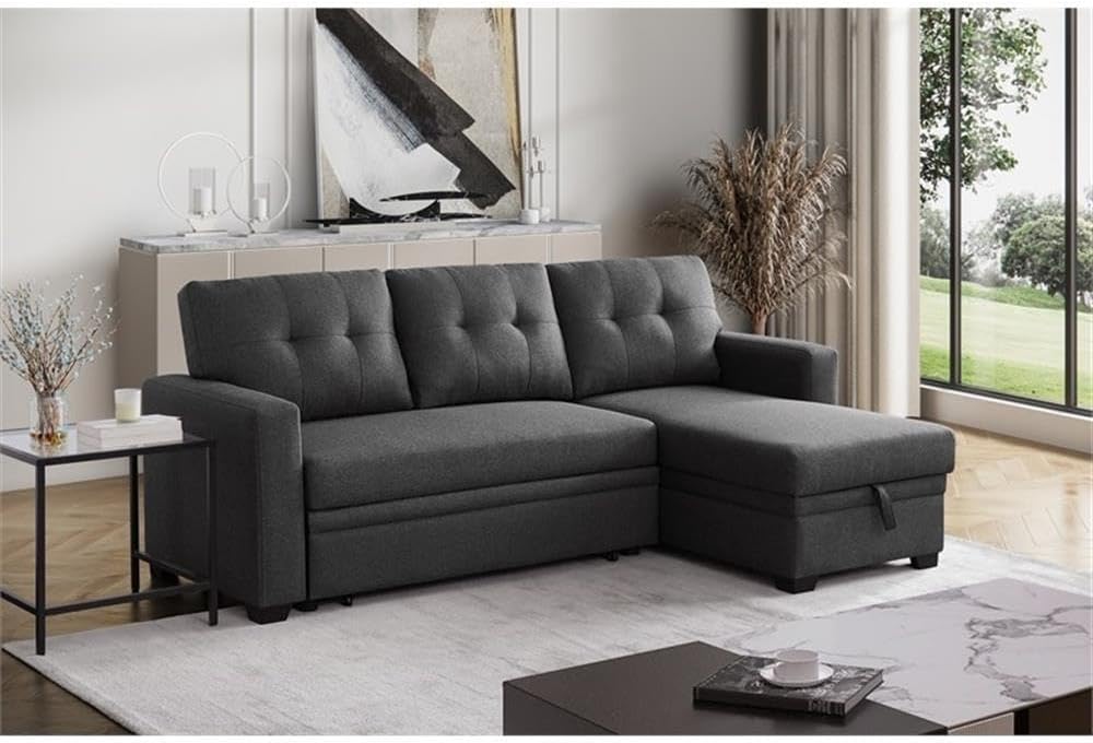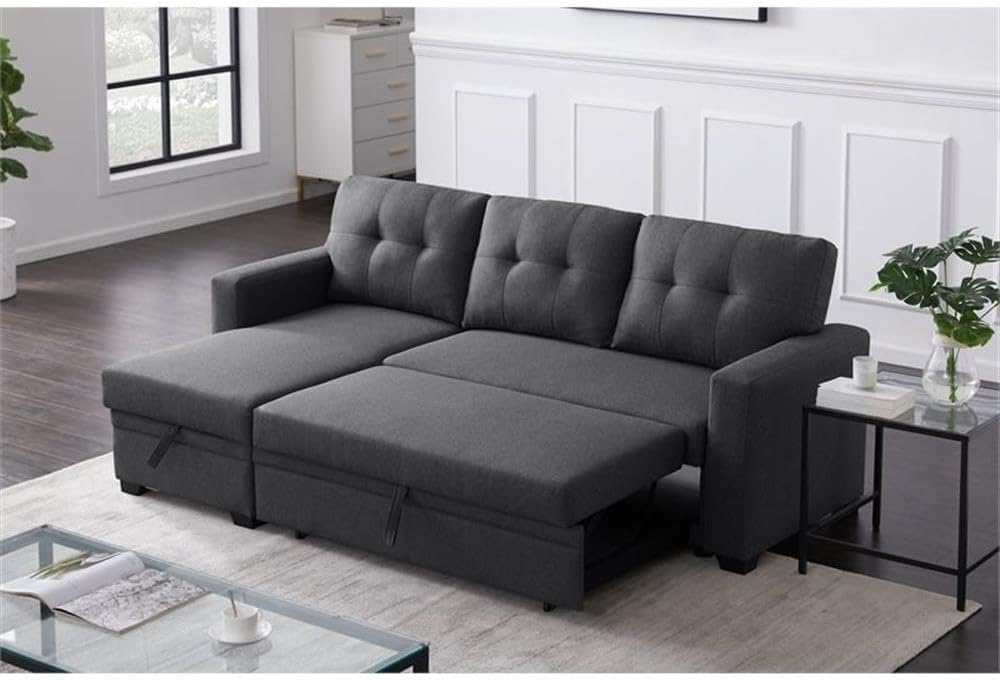 This convertible sectional brings spare sleeping space and modern style to your living room. A storage chaise creates the perfect place to tuck away linens for this sectional sofa and pull-out sleeper. Versatile style is accented with double tufting on each back cushion and track arms, perfect for modern, everyday living. When night falls, the sofa converts to a sleeper perfect for visitors to enjoy a comfortable rest.